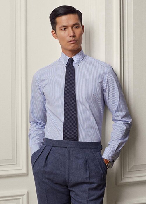 This shirt is crafted in Italy from 120s-quality cotton poplin and features a bengal-stripe pattern that is exclusive to Ralph Lauren.