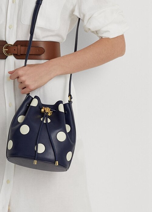 Crafted with supple full-grain leather, which is distinguished by its naturally smooth finish, the season’s take on the Andie drawstring bag is elevated with a polka-dot-debossed motif. Designed with a spacious silhouette for storing your essentials, it features an oversize “LRL” metal stopper for an iconic Lauren Ralph Lauren finish.