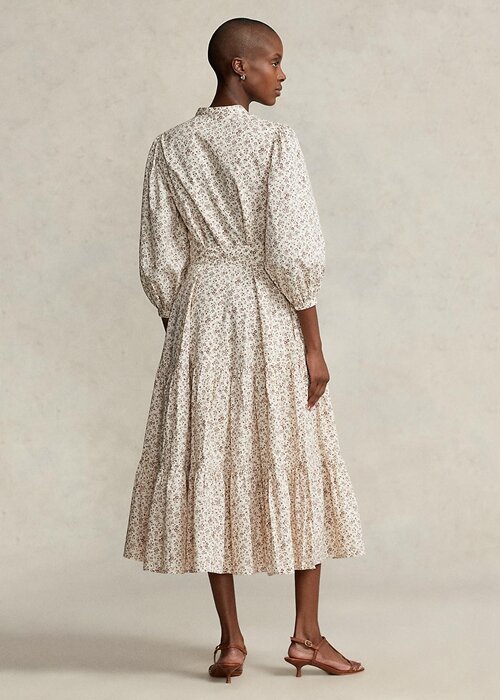 Shirring at the puffed sleeves and tiered skirt enhances the romantic appeal of this cotton dress, which features an allover floral motif. Genuine mother-of-pearl buttons add a luxe finish, while a self-belt spotlights the waist.
