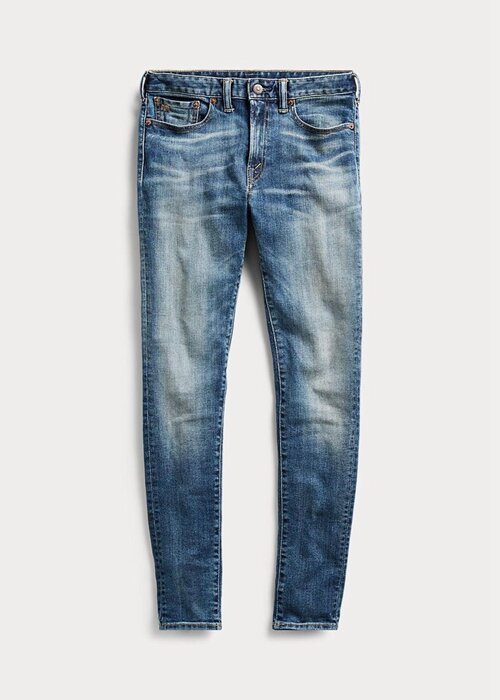 Skinny-fitting jeans made from 11.25 oz Japanese denim. Stretch-infused cotton for fit and fast recovery. Medium indigo wash with hand-sanding and distressing.